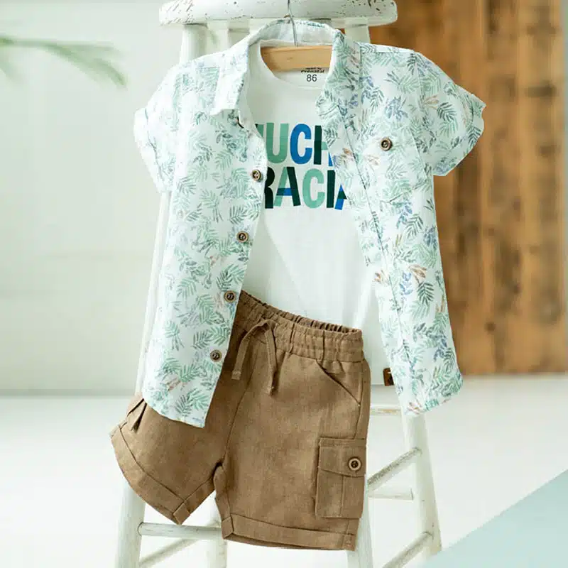 Je krijgt meteen zin in het Spaanse strandleven als je jouw kleine jongen dit setje van Prénatal aantrekt. Het setje bestaat uit een zomerse witte blouse met groene en blauwe varens. De zandkleurige short is lekker luchtig en is ideaal om in te spelen tijdens de warme zomerdagen. De absolute favoriet die dit setje compleet maakt is dit witte t-shirtje met de tekst ‘Muchas Gracias’. De letters zijn blauw, mint en groen gekleurd. Een fris shirtje dat ook goed is te combineren met de mintgroene short.